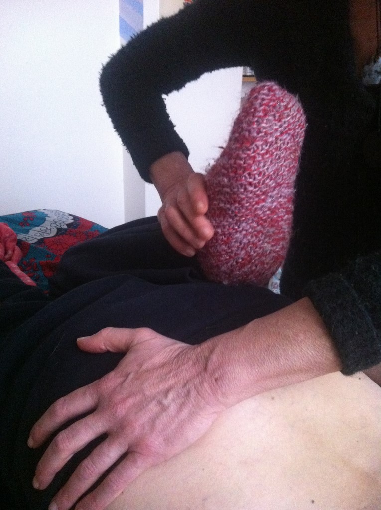 Paume de la main, les doigts. On enserre le bras avec les deux mains.. Elle favorise la circulation, détend les muscles.